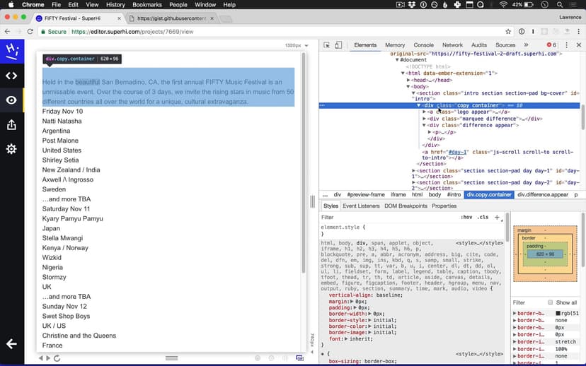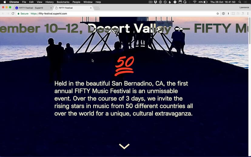 In our first week we will build a website for FIFTY Festival, which uses scrolling and animation effects in Javascript, along with flexbox and CSS blending effects