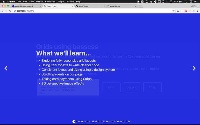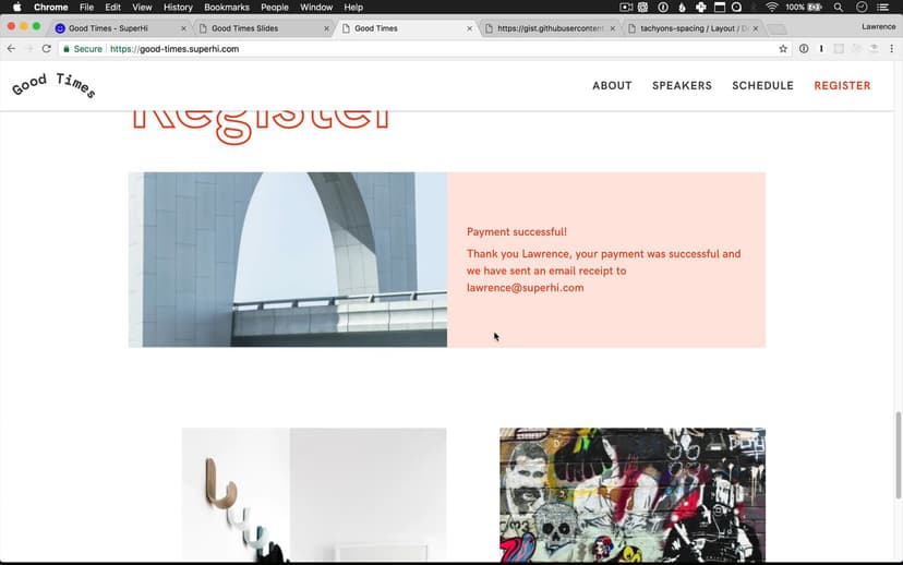 Good Times is a one day design event in Melbourne. The site uses responsive 12 column grid layouts, typographic effects, scrolling animations, parallax tilts, horizontal scrolling and Stripe for accepting payments from event attendees.