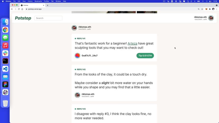 Potstop is a completely decentralized social network – one of the under-appreciated and under-hyped benefits of building on the Ethereum blockchain is the ability to have accounts that you can take with you. No more lock-in to a big company!