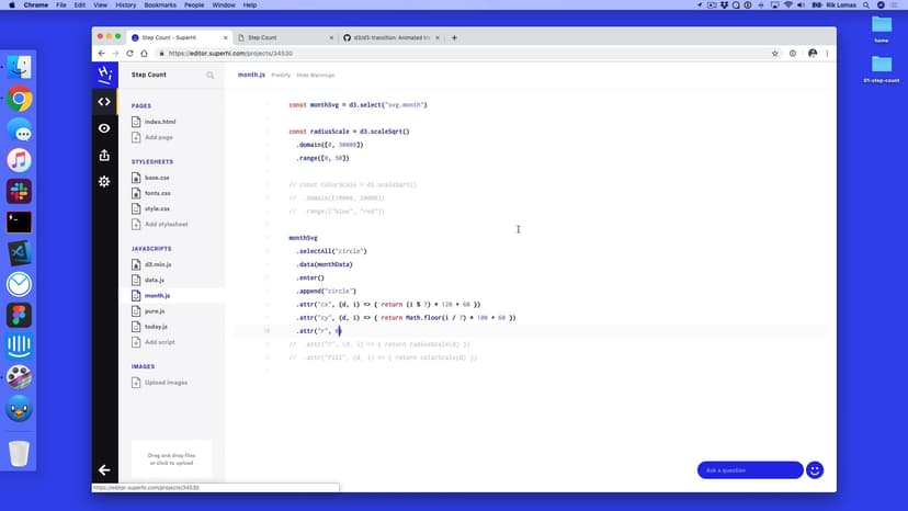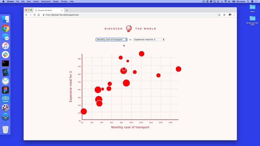 In this lesson, we use a scattergraph-style visualization to compare data in two dimensions. We also add in transitions on updated data, add in axes and talk about responsive designs.